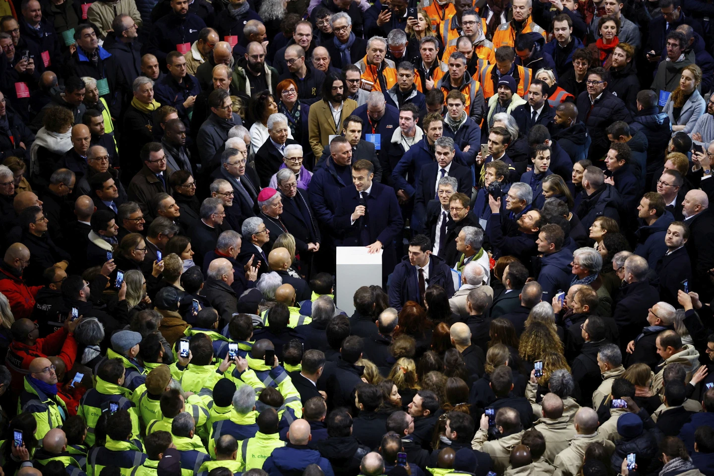 «Этот последний [перед открытием] визит — возможность выразить им особую благодарность: от мастеров по дереву до мастеров по металлу и камню, от лесорубов до кровельщиков, от изготовителей колоколов до реставраторов произведений искусства, от позолотчиков до каменщиков и скульпторов, от плотников до мастеров по изготовлению органов, от архитекторов, археологов, инженеров и планировщиков до специалистов по логистике и административных работников», — сказал Макрон.