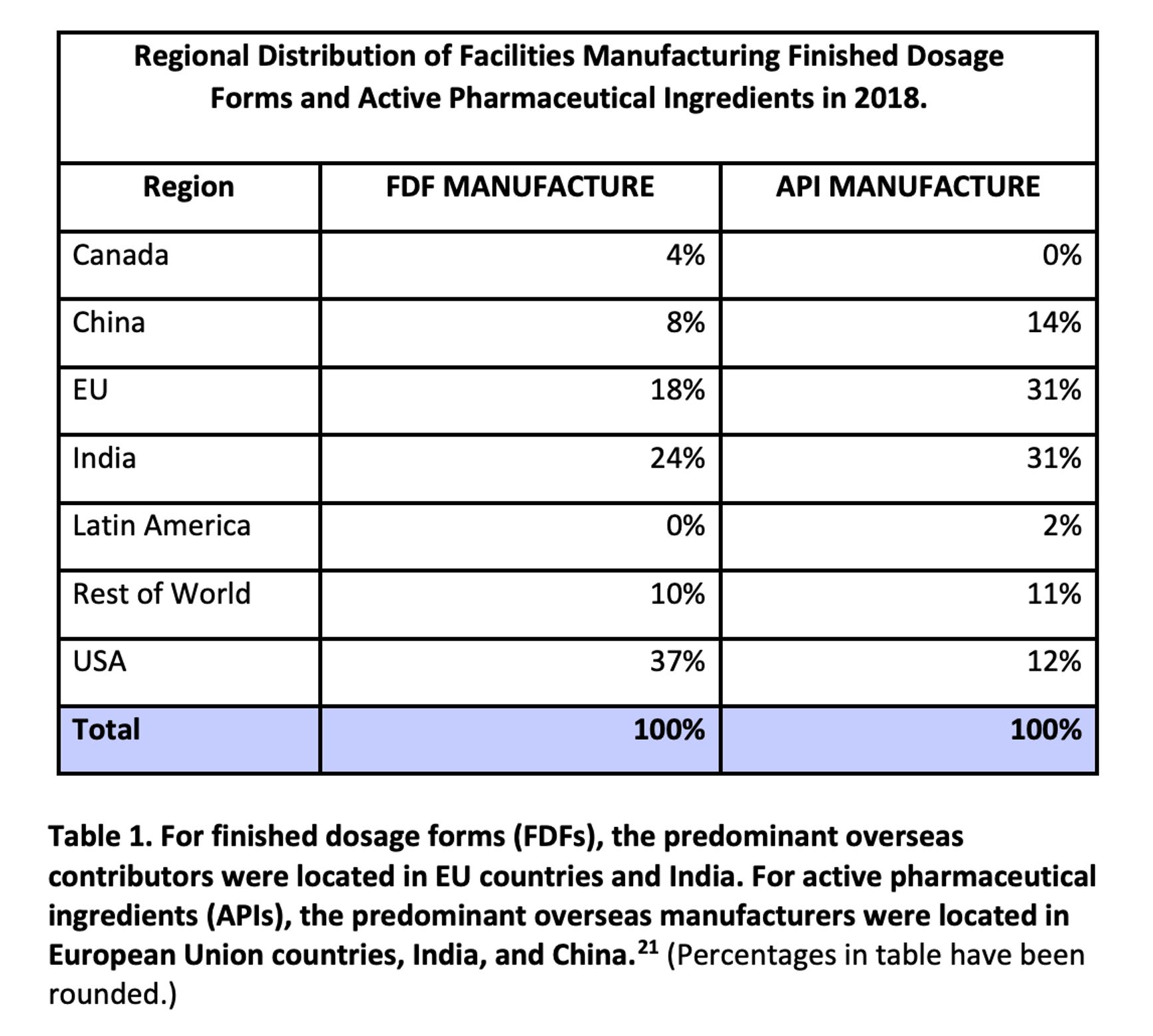 Фармацевтическая отрасль Соединенных Штатов — как и большинства стран мира — зависит от иностранных компонентов, однако нет точных цифр, насколько. По оценке исследователей Университета Джонса Хопкинса, опубликованной по итогу пандемии COVID-19, из всех зарегистрированных в мире фармацевтических субстанций (грубо говоря, основного действующего вещества или набора веществ в каждом лекарстве) только 14% производились в США.