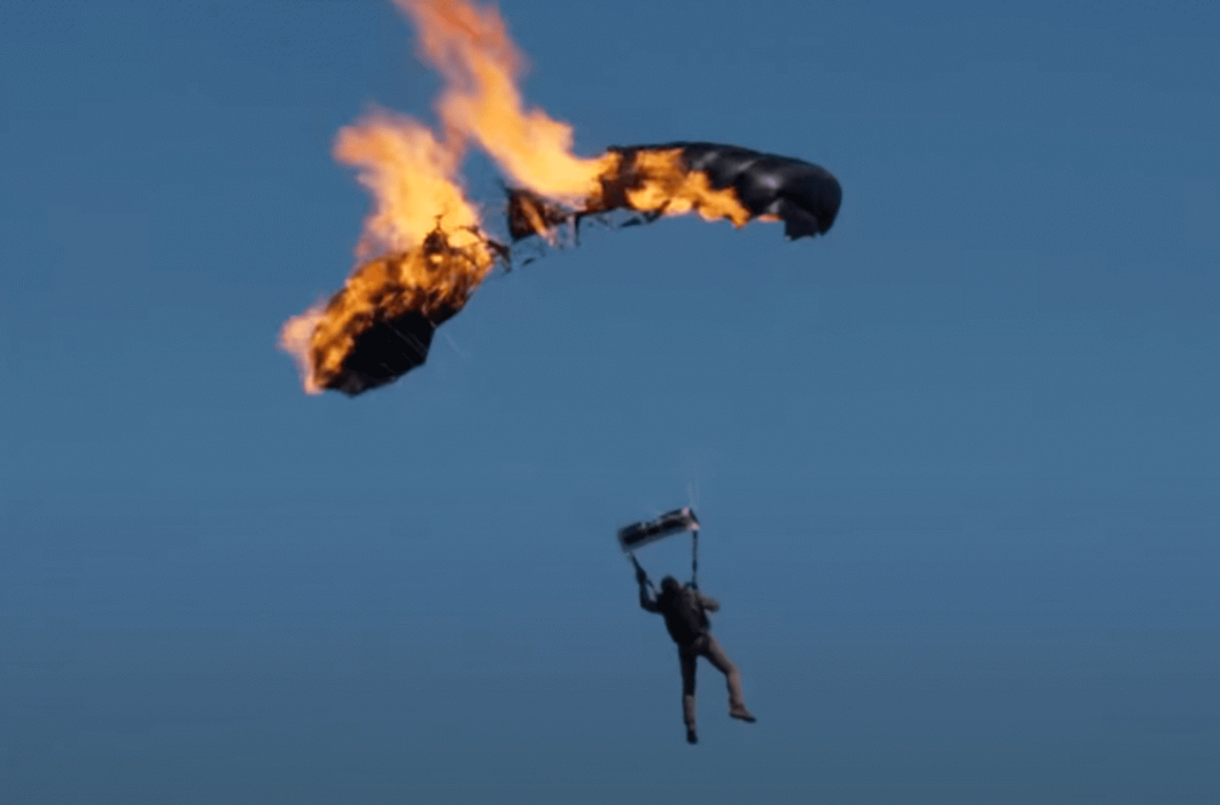 62-летний Круз выполнил 16 прыжков в национальном парке «Драконовы горы» в ЮАР. По задумке сцены, актера поднимают на вертолете и сбрасывают с парашютом, пропитанным горючим и подожженным прямо перед прыжком. Во время полета Круз должен отрезать горящую часть и раскрыть запасной парашют. На постановку трюка съемочная группа потратила несколько недель.