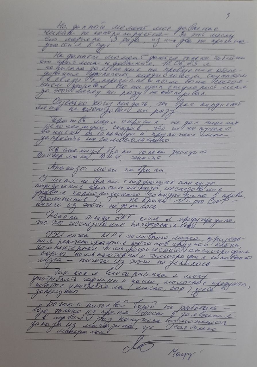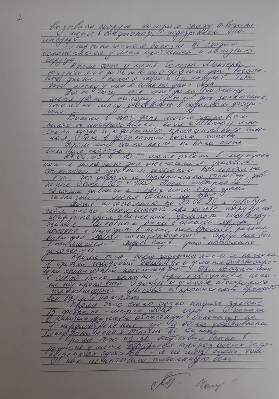 Сейчас по состоянию на 30.06.25 я чувствую себя плохо, меня шатает при ходьбе, нарушена координация движений, тошнота, головокружение. Сильные боли в области сердца, которые я ощущаю в последнее время, резкие боли для меня не характерны: сердце как бы сжимается. Падает слух, уши постоянно заложены. Кроме того, перед задержанием я лежала в 3-й городской больнице, у меня диагностировали хронический пиелонефрит. При поступлении в СИЗО было холодно, при прогулке я попала под проливной дождь, и у меня обострились пиелонефрит, цистит и хронический бронхит, все время кашляю.