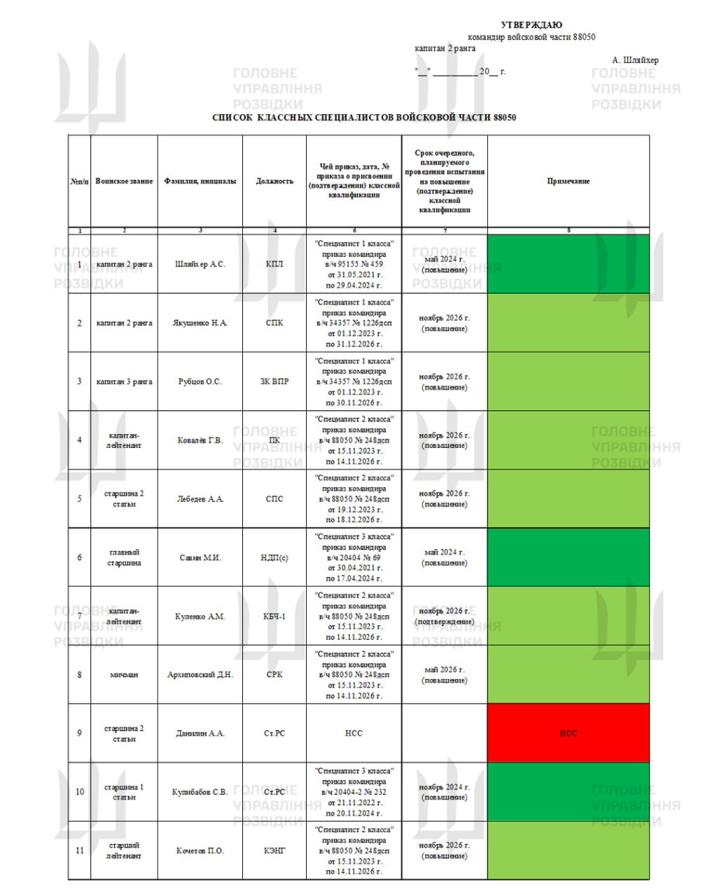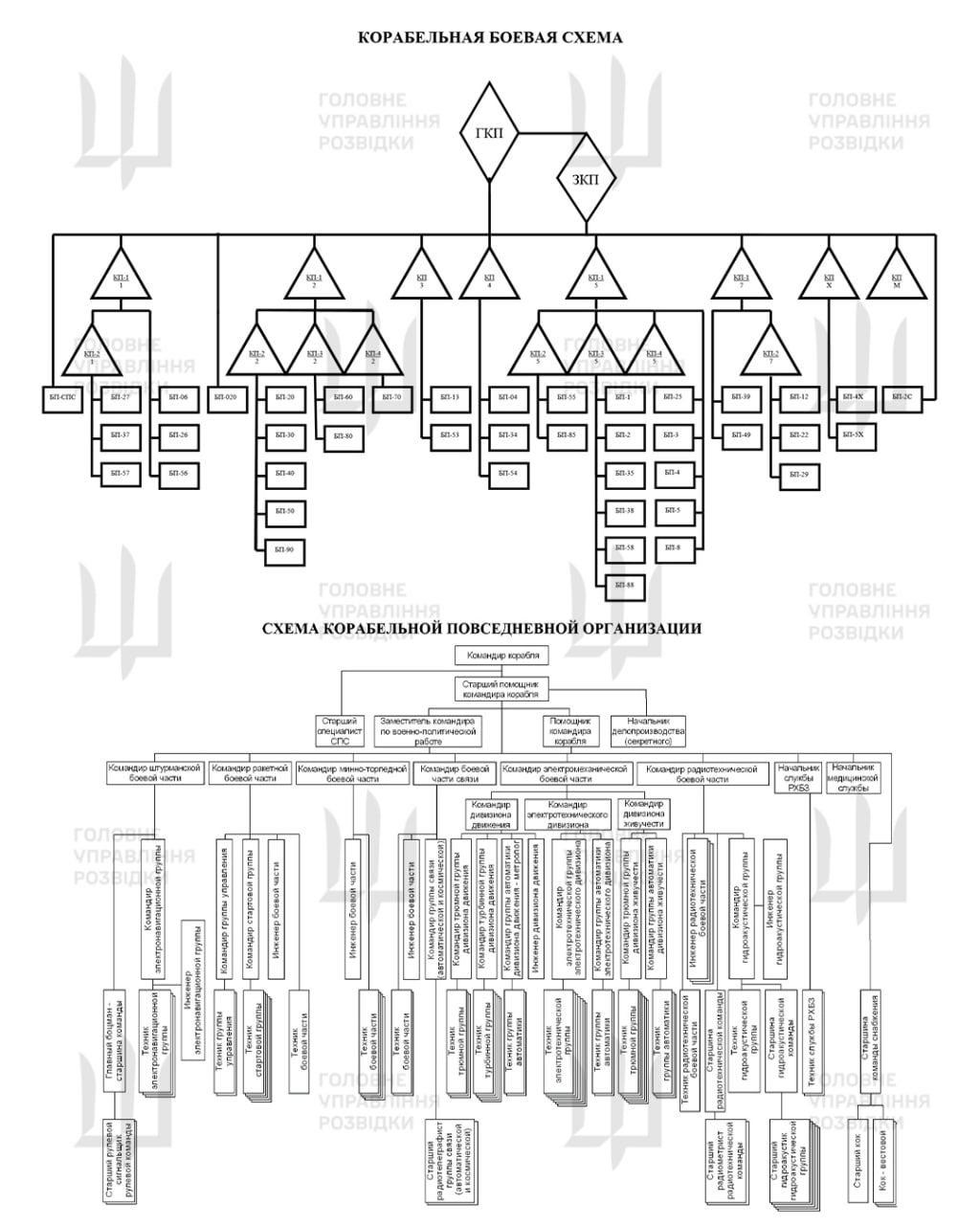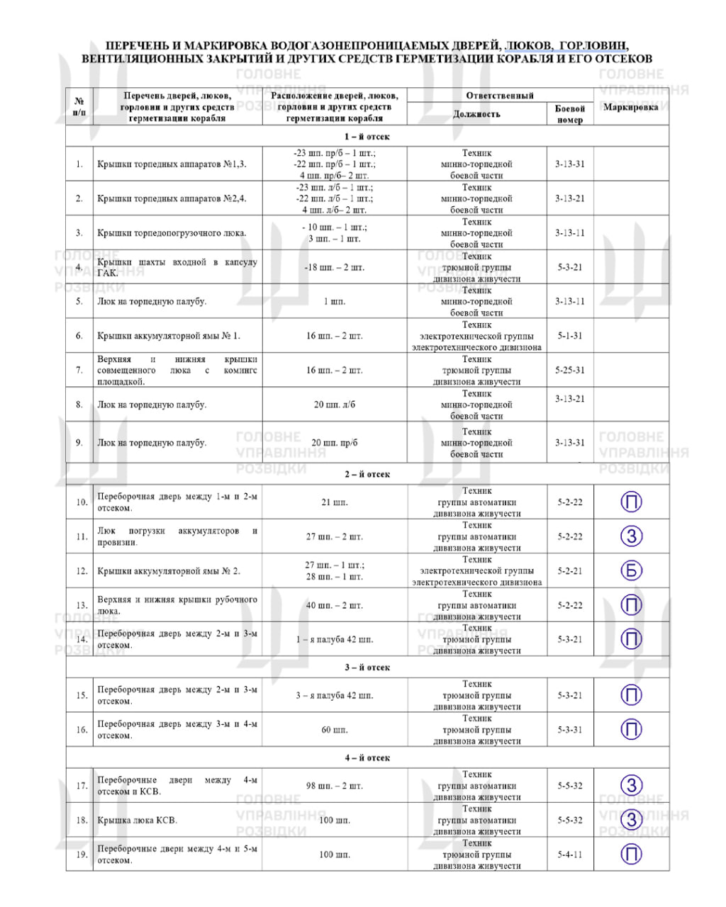 Среди обнародованных материалов — боевые инструкции для экипажа, схема боевого управления кораблем, инженерная документация, акт осмотра поврежденного радиобуя, схемы герметизации отсеков, корабельное расписание и поименные списки личного состава, включая оценки физической подготовки, должности и квалификацию.