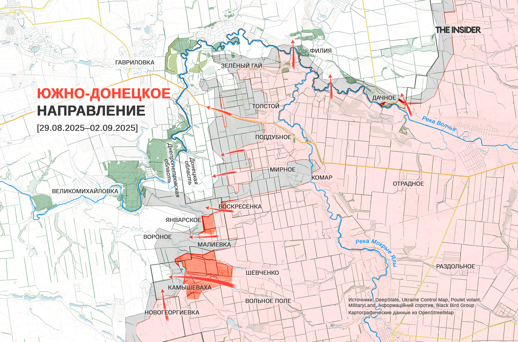 - На южно-донецком направлении российские силы продвигаются на стыке Донецкой и Днепропетровской областей