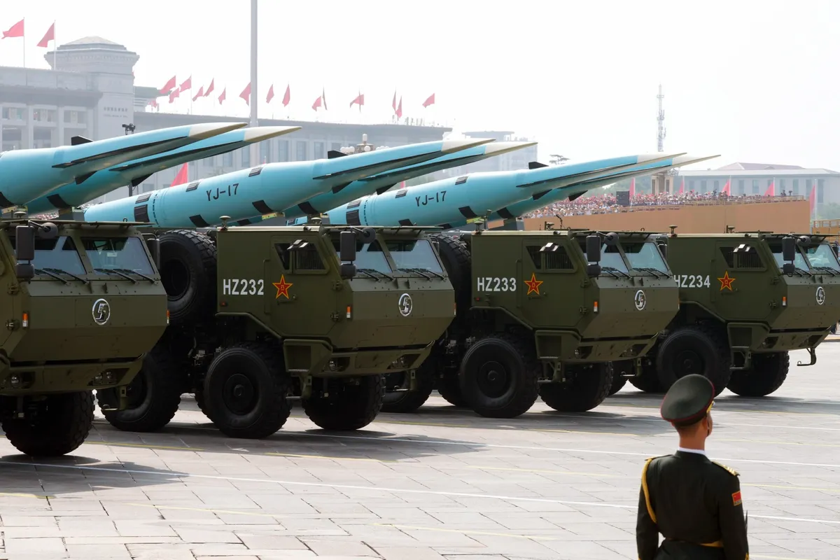 Китай продемонстрировал во время парада разнообразные новые вооружения, пишет Bloomberg. Агентство упоминает межконтинентальную баллистическую ракету DF-5C («Дунфэн-5С»), гиперзвуковую противокорабельную баллистическую ракету YJ-21 ( «Инь Цзи-21»), а также новейшие системы противовоздушной обороны (в частности, систему LY-1, которая, по всей видимости, оснащена лазерным оружием), подводный беспилотник AJX002 и коллекцию роботов-собак.