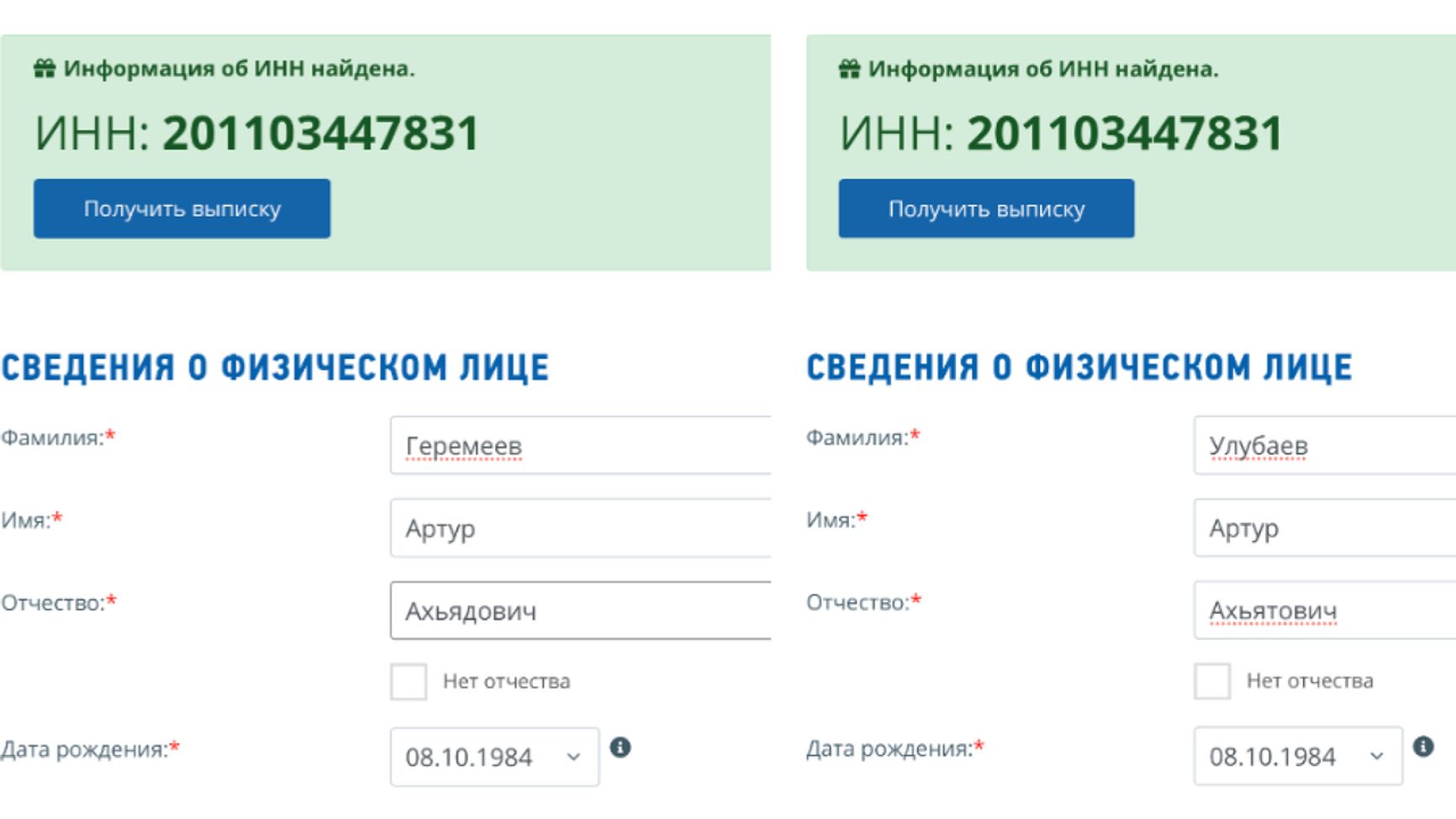То, что это один и тот же человек, подтверждает форма проверки ИНН на сайте Федеральной налоговой службы: у Улубаева и Геремеева один ИНН.