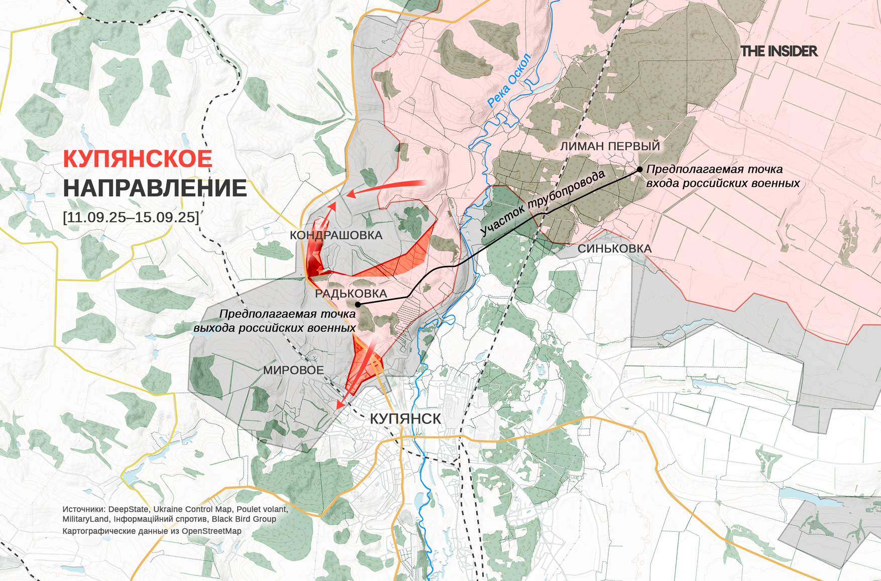 Российские военные пересекают реку Оскол и попадают на правобережные окраины Купянска через трубопровод, который ведет от Лимана Первого до Радьковки, рассказали в DeepState. По их оценке, весь маршрут занимает четыре дня. Авторы проекта напоминают, что подобные операции ВС РФ уже проводили в районе Авдеевки в Донецкой области и Суджи в Курской области. Аналитики отметили продвижение ВС РФ в Купянске и в районе Кондрашовки.