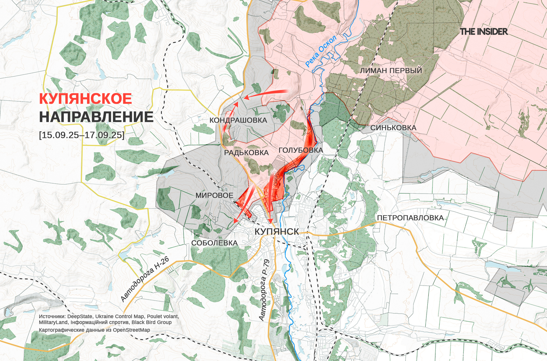 DeepState фиксирует расширение зоны контроля ВС РФ на севере правобережной (западной) части Купянска, а также в районе Голубовки к северо-востоку. Российским войскам осталось чуть более километра до дороги, ведущей в Купянск с запада, со стороны Изюма и Чугуева.