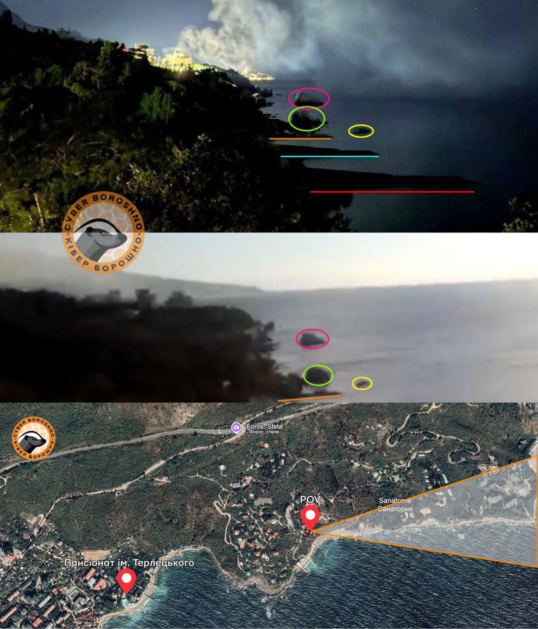 Обновление: OSINT-аналитики «КіберБорошно» пишут, что опубликованные в сети снимки предположительно с дымом от удара свидетельствуют о прилете не по этому санаторию — угол съемки повернут в противоположную сторону (геолокация точки, с которой велась съемка). Крымские власти утверждают, что удар пришелся по санаторию «Форос».