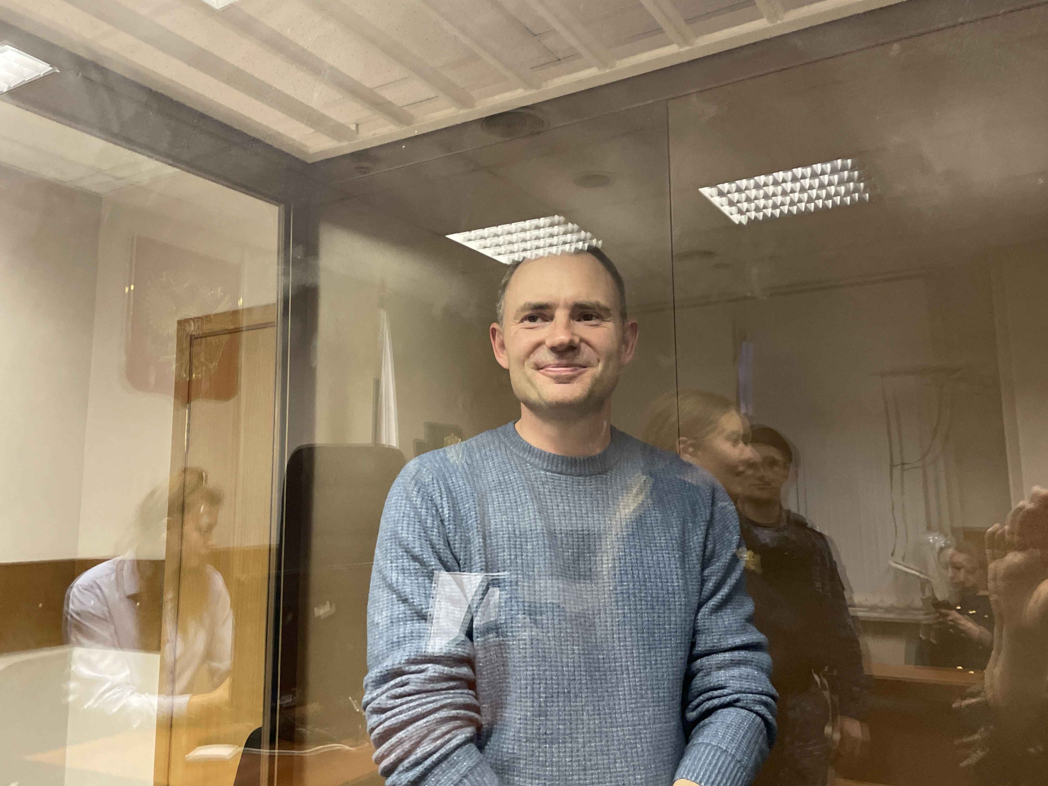 Максим Круглов в судебном аквариуме в ожидании вынесениях ему меры пресечения в виде заключения под стражу. Женщина в черном в отражении – его адвокат Наталия Тихонова.