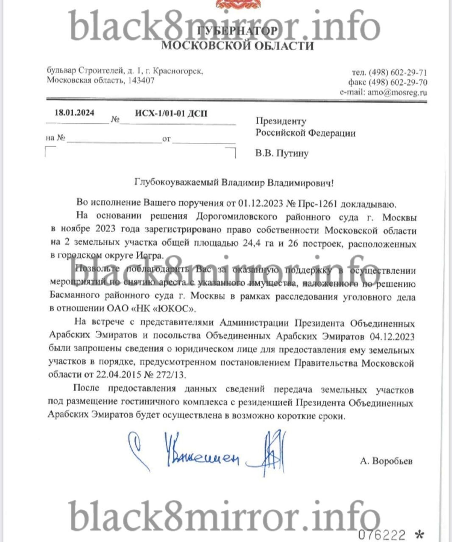 В нем Воробьёв пишет, что на основании поручения Путина, на встрече с представителями ОАЭ в декабре 2023-го у эмиратской стороны запросили сведения о юрлице, которому передадут земельные участки в Подмосковье. Речь идет, как следует из письма, о двух земельных участках в горокруге Истра, которые были переданы в собственность области ранее, в ноябре того же года.