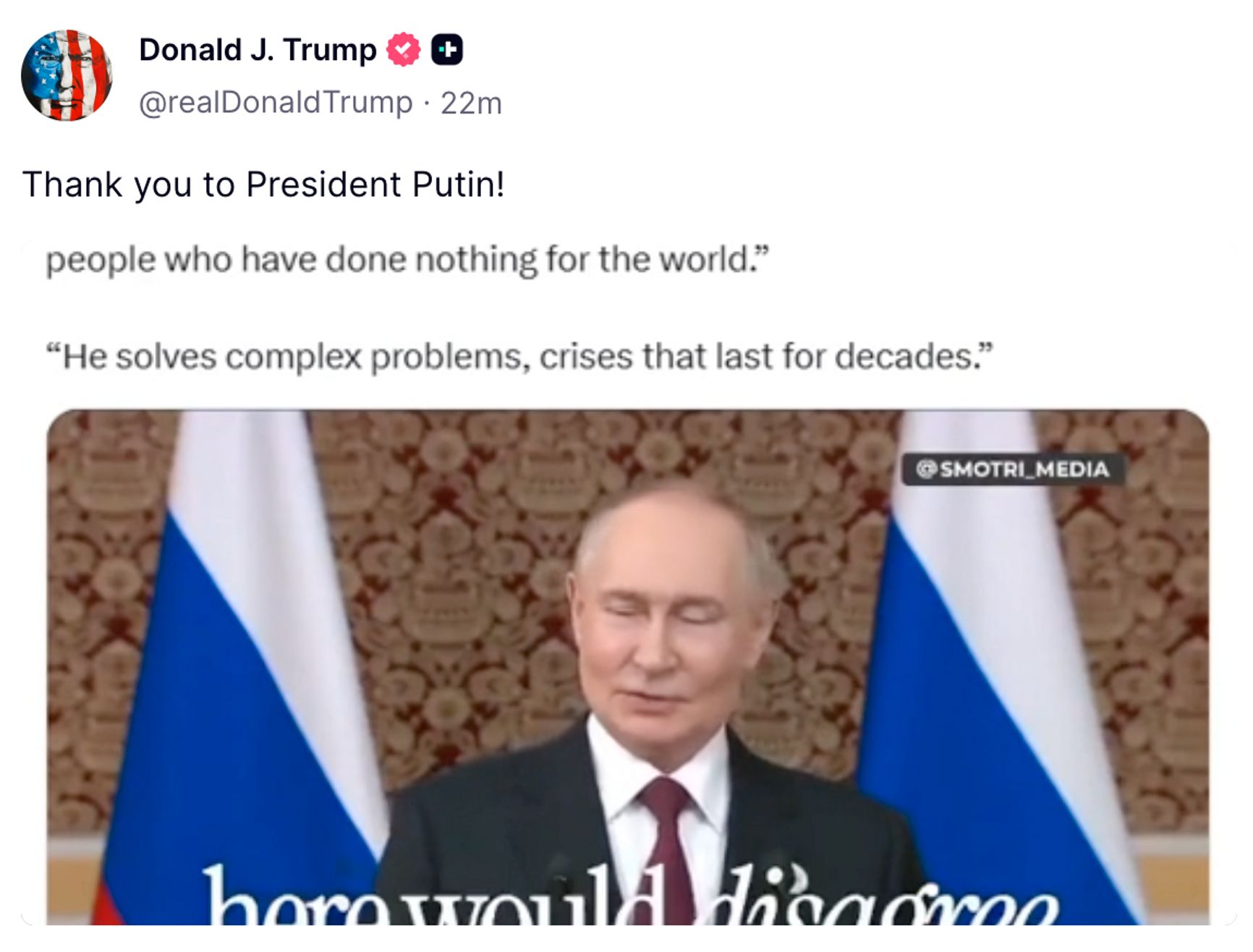 Трамп опубликовал пост в своей соцсети Truth Social, в котором похвалил Владимира Путина, сказавшего, что президент США много делает для установления мира на Земле. Он написал: «Спасибо вам, президент Путин», — и снабдил свою публикацию записью трансляции, в которой Путин отвечает на вопросы журналистов во время визита в Таджикистан, выложенной на российском сервисе Smotri.