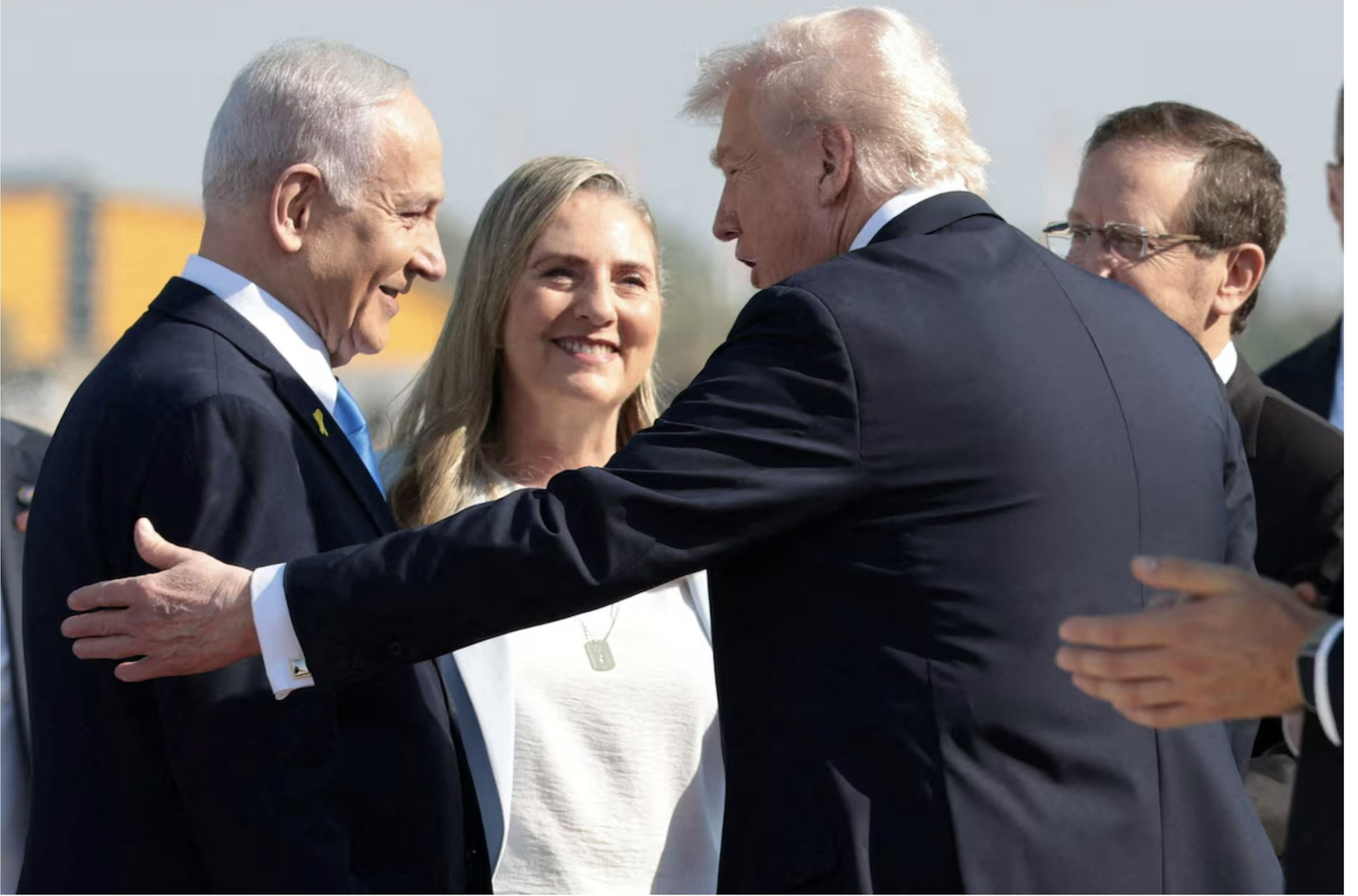 Премьер-министр Израиля Биньямин Нетаньяху приветствует президента США Дональда Трампа в международном аэропорту Бен-Гурион на фоне обмена пленными и заложниками, достигнутого при посредничестве США, и соглашения о прекращении огня между Израилем и ХАМАС в Лоде, Израиль, 13 октября 2025 года. REUTERS/Evelyn Hockstein