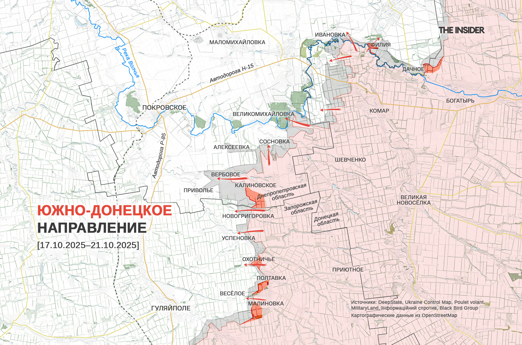 В DeepState сообщили, что ВС РФ продвинулись в районе Малиновки, Полтавки и Калиновского на западном фланге направления. Анатолий Радов, в свою очередь, сообщает о боях севернее Филии и Дачного на северном фланге.