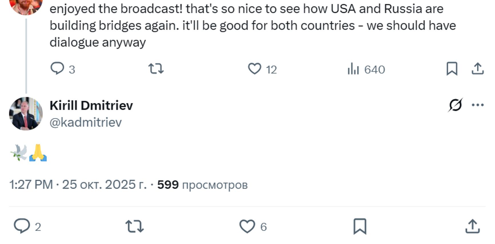 Стоит отметить, что Дмитриев на своей странице в Twitter (X) многократно ругал традиционные западные медиа за предвзятость и отсутствие объективности. В частности он репостнул твит Роберта Ф. Кеннеди со сравнением аудитории консервативных и либеральных спикеров, приписав: «Консервативные идеи доминируют на рынке свободной мысли в социальных сетях, в то время как ложные глобалистские нарративы благополучно живут в цензурированном подземелье традиционных СМИ. Консервативные идеи побеждают, когда их не подавляют». Вероятно, по мнению Дмитриева, ни блокировка Twitter в России, ни повышение популярности определенных идей и их сторонников с помощью ботов и троллей «рынку свободной мысли» не мешают.