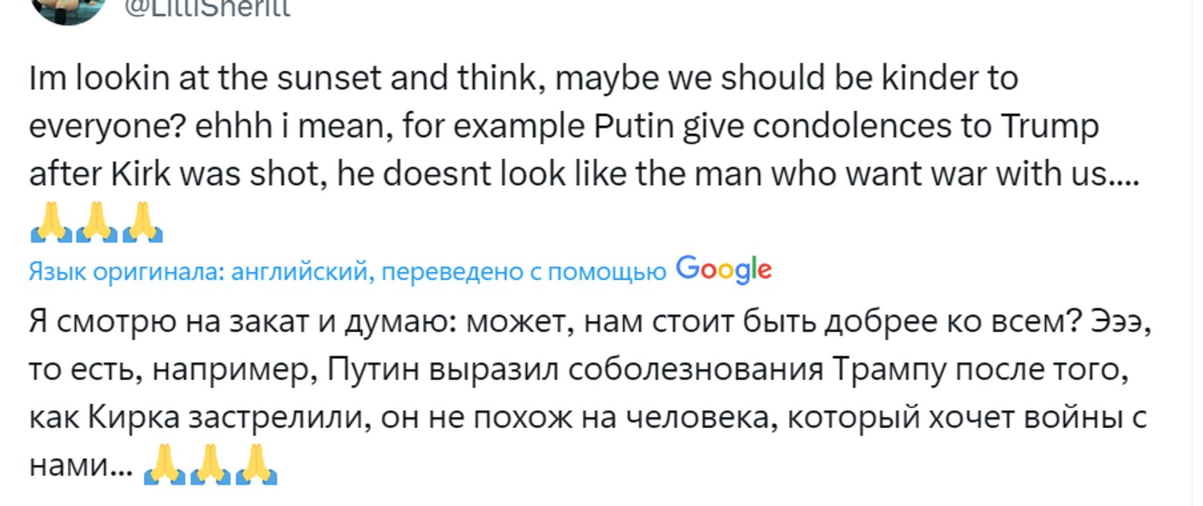 Кроме просто одобрительных комментариев Дмитриеву, аккаунты из этой сети ботов распространяют привычные для кремлевской пропаганды нарративы, которые использовались и ранее: например, боты соболезнуют убитому правому активисту Чарли Кирку, ругают Демократическую партию или предпринимателя и благотворителя Джорджа Сороса, хвалят Дональда Трампа и Владимира Путина. Хотя они и пишут на английском языке, заметно, что он для них не родной, — фразы выстроены примитивно и часто с грубыми ошибками.
