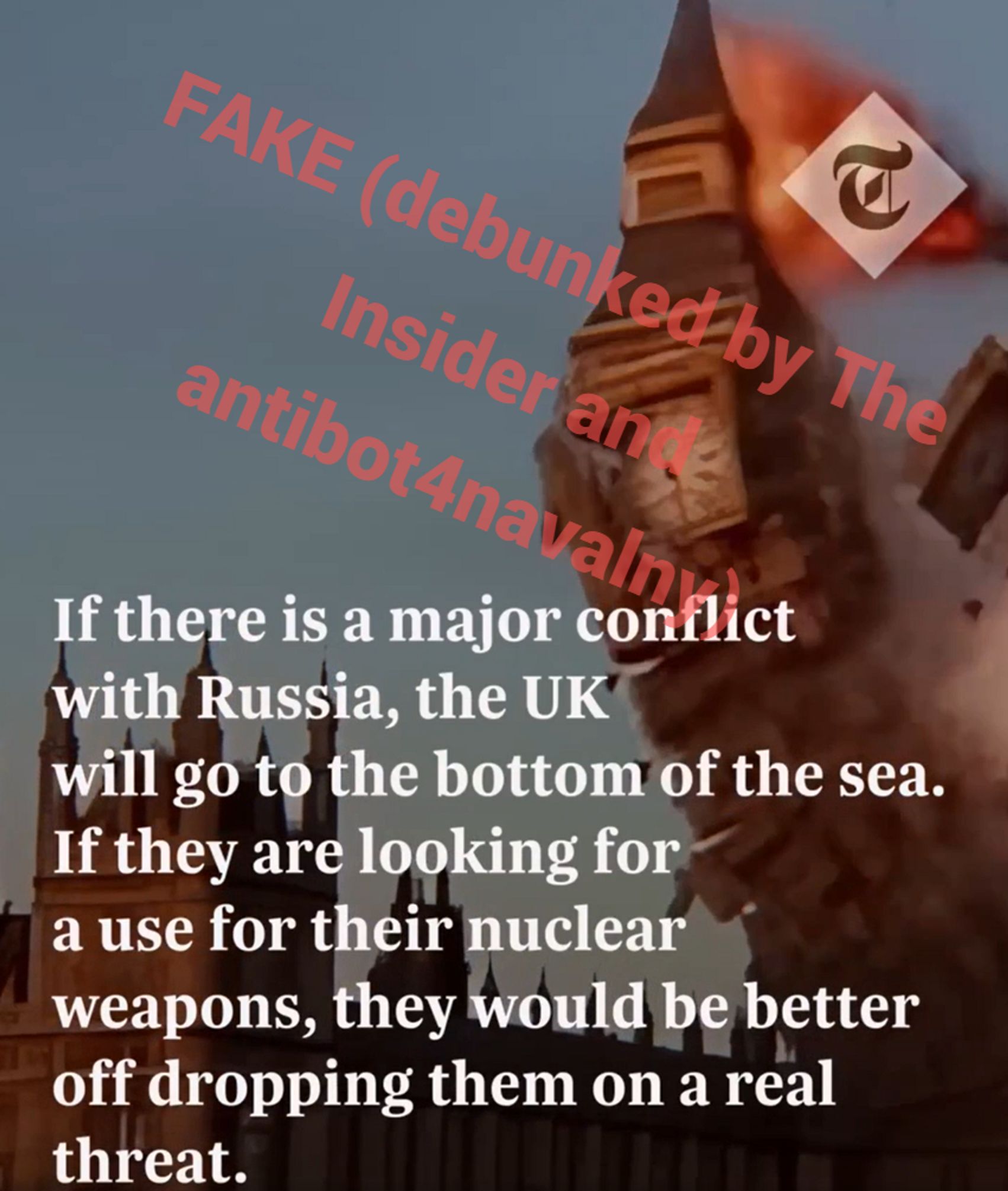 В другом видео, замаскированном под контент британского издания The Telegraph, говорится, что немецкий реваншизм поддерживается Великобританией и хочет развязать с Россией ядерный конфликт. В видео использовано лицо и имя немецкого политолога Томаса Дица. Ему приписывают поистине апокалиптические прогнозы: якобы британские власти надеются, что от последствий применения ядерного оружия государство будет защищено своим островным положением, тогда как на самом деле оно уйдет под воду, став «новой Атлантидой».