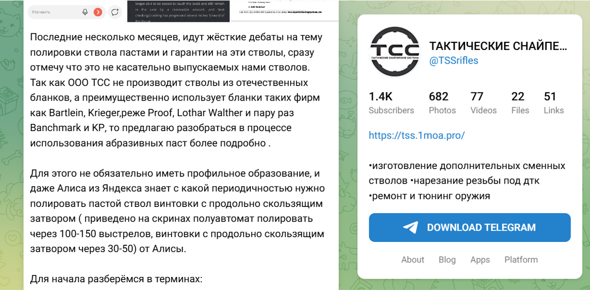 Высокоточная стрельба на дальние дистанции предъявляет очень высокие требования к геометрии ствола винтовки, что ограничивает ресурс такого оружия сотнями выстрелов. Решать эту проблему помогают российские производители оружия, которые в большинстве случаев используют импортные, преимущественно американские компоненты. В декабре 2024 года ООО «Тактические снайперские системы» (ТСС) опубликовало в своем Telegram-канале результат перестволовки винтовки Cadex, «модифицированной для “СВО”». Критическую роль в этом процессе играет бланк — заготовка будущего ствола. Как можно узнать из другой публикации ТСС, компания «не производит стволы из отечественных бланков, а преимущественно использует бланки таких фирм как Bartlein, Krieger, реже Proof Research, Lothar Walther». Те же бланки Bartlein до недавнего времени использовала и «Московская Оружейная Компания», выпускающая винтовки BespokeGun.