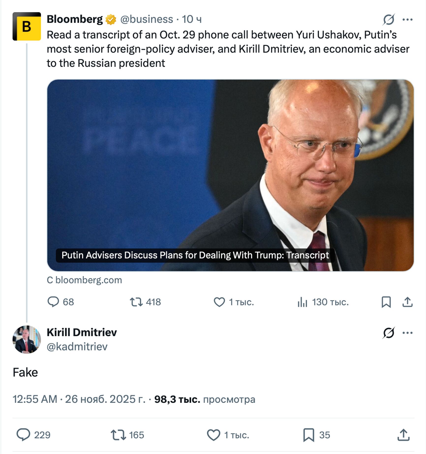 Помощник Владимира Путина Кирилл Дмитриев назвал фейком публикацию Bloomberg, обнародовавшего расшифровки двух телефонных разговоров с обсуждением мирного плана для Украины — беседы Уиткоффа с помощником Путина Юрием Ушаковым и последовавшей за ним беседы Ушакова с Дмитриевым. Под сообщением Bloomberg в Twitter Дмитриев оставил короткий комментарий: «Фейк».