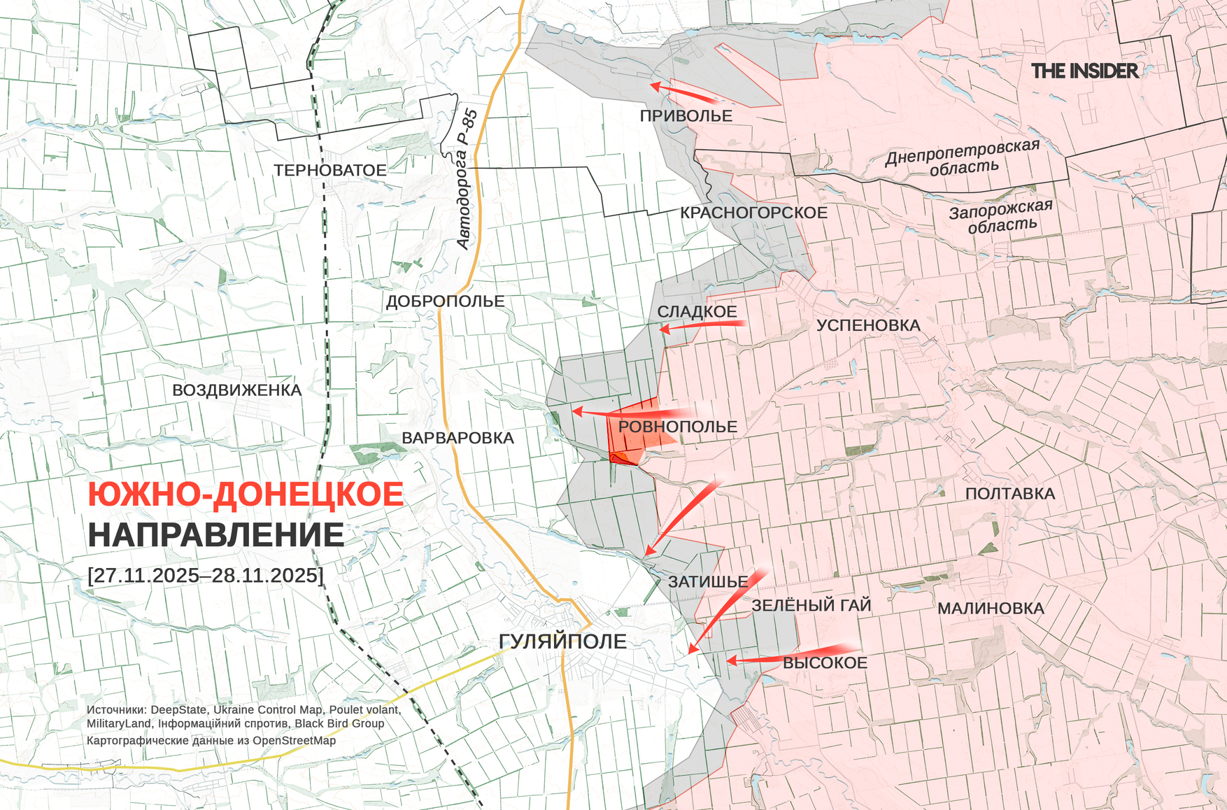 Владимир Путин заявил о готовности к переговорам с США по урегулированию войны в Украине на базе 28 пунктов плана Дмитриева — Ушакова. В то же время российский лидер настаивает, что для прекращения огня СОУ должны оставить территории, «аннексированные» Россией (имеется ли в виду только Донбасс или также Херсонская и Запорожская области, Путин не уточнил). Он рассказал об успехах ВС РФ в Волчанске, Покровске (до 2016 года — Красноармейск) и Северске. Кроме того, Путин сообщил о боях в Комсомольске. Издание «Агентство» отмечает, что в зоне боевых действий нет городов, которые носят или ранее носили такое название, а Путин, скорее всего, по ошибке назвал Комсомольском Константиновку, где действительно идут городские бои.