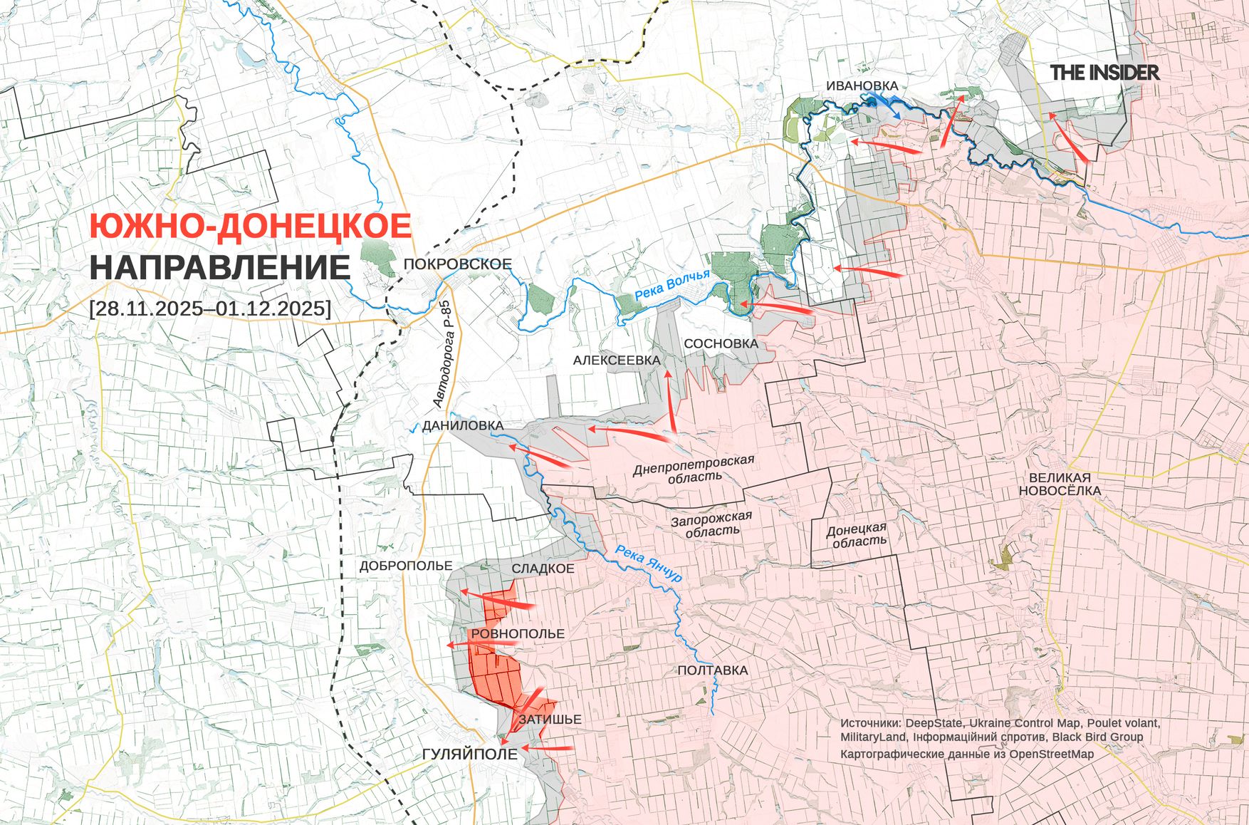 Также в DeepState обвиняют украинское оперативное командование «Південь» в использовании архивных кадров лета 2025 года из Курской области для иллюстрации стабилизации фронта в районе Гуляйполя силами 33-го ОШП, хотя это подразделение действует несколько в другом районе. В проекте зафиксировали (1, 2) продвижение ВС РФ в районе Ровнополья и Гуляйполя. Юрий Котенок сообщает, что ВС РФ ведут бои в восточной и северной части Гуляйполя и продвигаются севернее города, где штурмуют Доброполье.