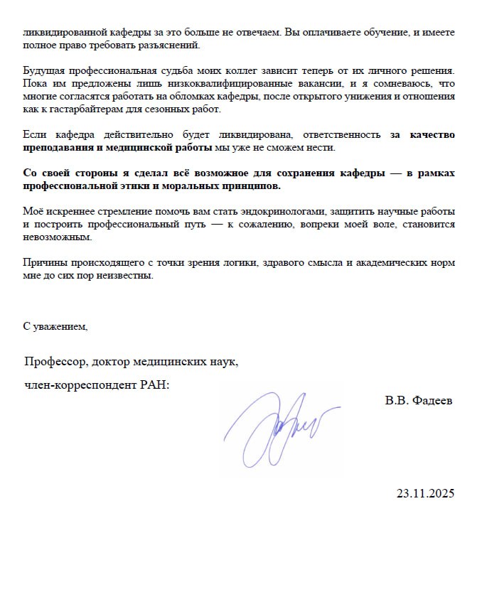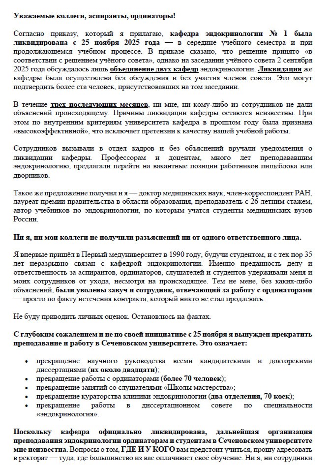 «Согласно приказу, который я прилагаю, кафедра эндокринологии № 1 была ликвидирована с 25 ноября 2025 года в середине учебного семестра и при продолжающемся учебном процессе. В приказе сказано, что решение принято „в соответствии с решением ученого совета“ , однако на заседании ученого совета 2 сентября 2025 года обсуждалось лишь объединение двух кафедр эндокринологии. Ликвидация же кафедры была осуществлена без обсуждения и без участия членов совета. Это могут подтвердить более ста человек, присутствовавших на том заседании».