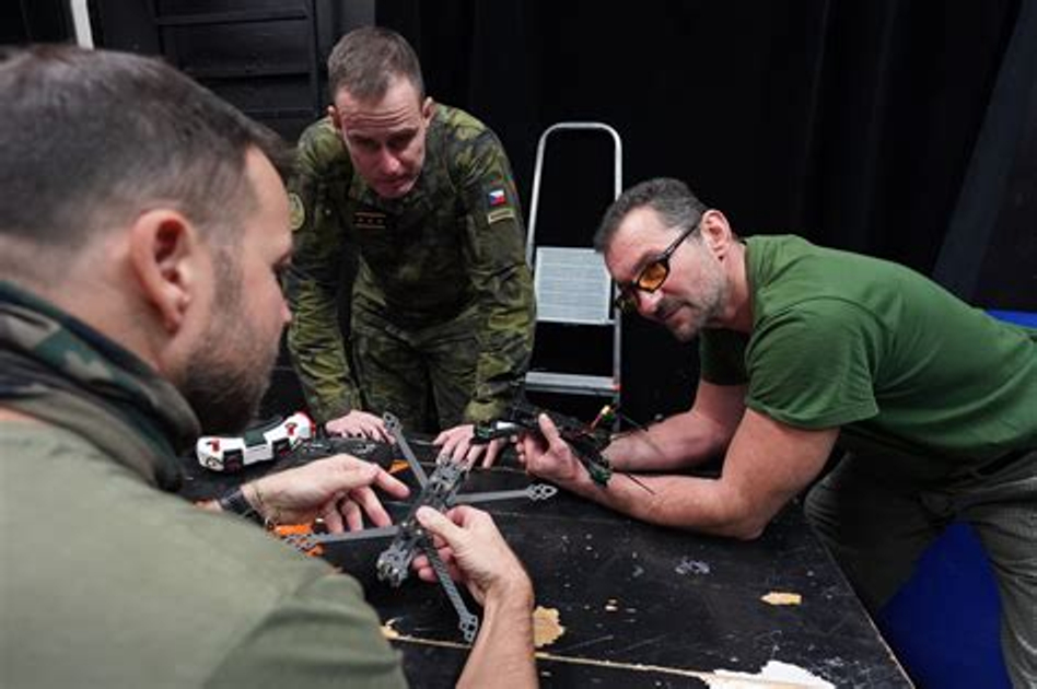 Начальник Генштаба Вооруженных сил Чехии Карел Ржегка и актер Ондржей Ветхий, представляющие Nemesis, осматривают FPV-дроны. Фото: Nemesis