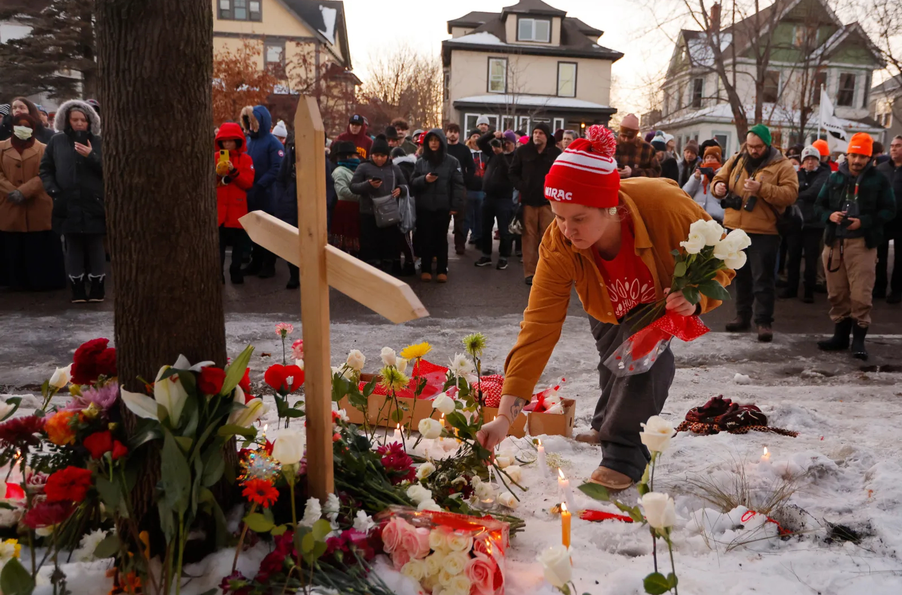 Траурная церемония на месте стрельбы ICE по автомобилю, в результате которой погибла женщина. Фото: AP