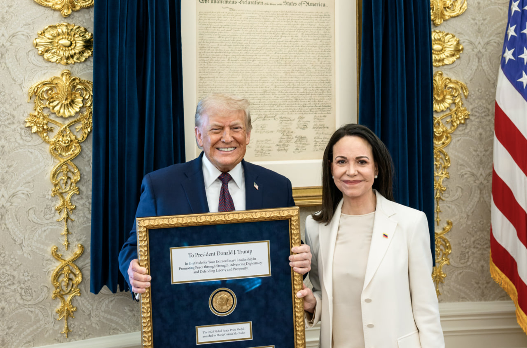 Лидер оппозиции Венесуэлы, ставшая лауреатом Нобелевской премии мира в прошлом году, Мария Корина Мачадо вручила свою награду президенту США Дональду Трампу. Это произошло на встрече в Белом доме накануне, 15 января, пишет агентство Reuters.