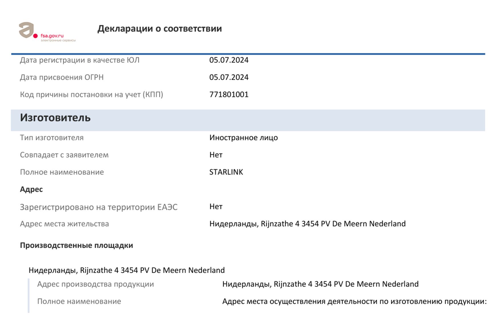 Например, в декларации соответствия от июня 2025 года для продукта, названного «Навигационный комплект Starlink Marine», производитель вообще не указан, а предоставленный адрес в Нидерландах принадлежит местной компании Castor Marine — официальному дистрибьютору Starlink Maritime.