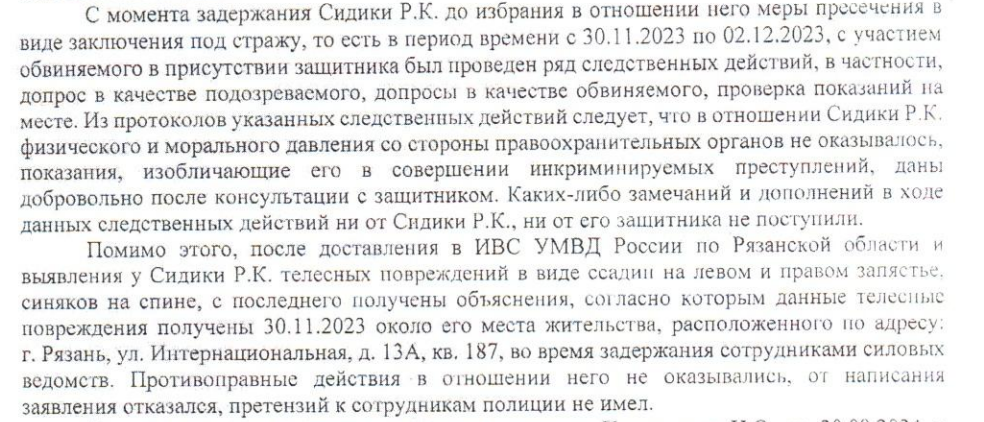 «С момента задержания Сидики Р.К. 30.11.2023 <...> с участием обвиняемого в присутствии защитника был проведен ряд следственных действий, в частности, допрос в качестве подозреваемого, допросы в качестве обвиняемого, проверка показаний на месте. Из протоколов указанных следственных действий следует, что в отношении Сидики Р.К. физического и морального давления со стороны правоохранительных органов не оказывалось, показания, изобличающие его в совершении инкриминируемых преступлений, даны добровольно после консультации с защитником», — говорится в документе.