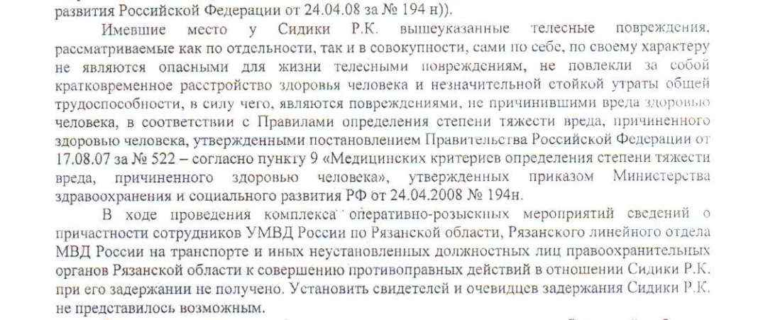 При этом в отказе упоминается, что 2 декабря при освидетельствовании в московском СИЗО-7 на теле Сидики нашли многочисленные раны, ссадины, гематомы и ушибы. Однако, по мнению следователя, в составленных по итогам освидетельствования документах «отсутствуют морфологические характеристики» повреждений, что не позволяет определить, когда и как они были нанесены. Кроме того, утверждается, что полученные Сидики травмы «не являются опасными для жизни и не повлекли расстройства здоровья».