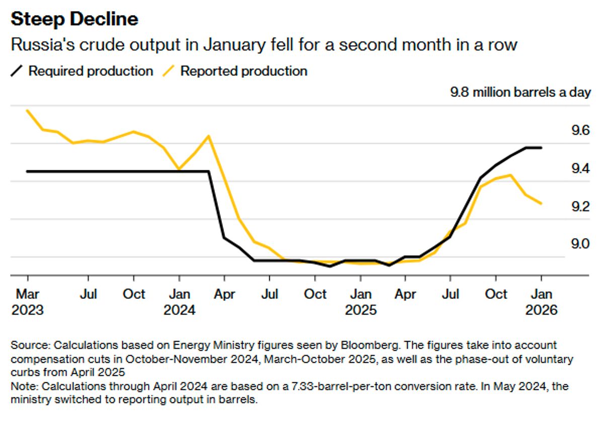 По итогам января добыча нефти в России составила в среднем 9,28 млн баррелей в сутки — по подсчетам агентства Bloomberg, она снижается второй месяц подряд. На этом фоне, напротив, растет объем российской нефти на танкерах в море, которая не может найти своих покупателей из-за усиления давления на «теневой флот».
