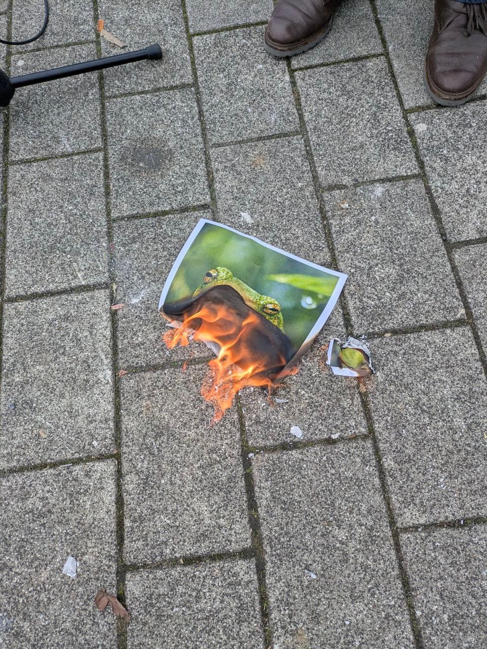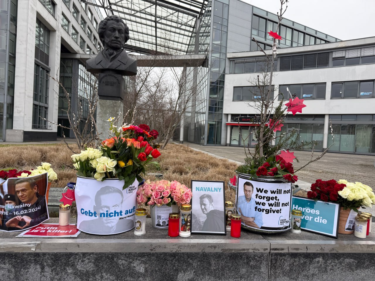 Памятные акции проходят и за рубежом. Утром русскоязычные жители Дюссельдорфа сожгли фотографию эквадорской лягушки, возложили цветы и свечи, установили баннеры «Не забудем, не простим» и фотографии Алексея Навального.