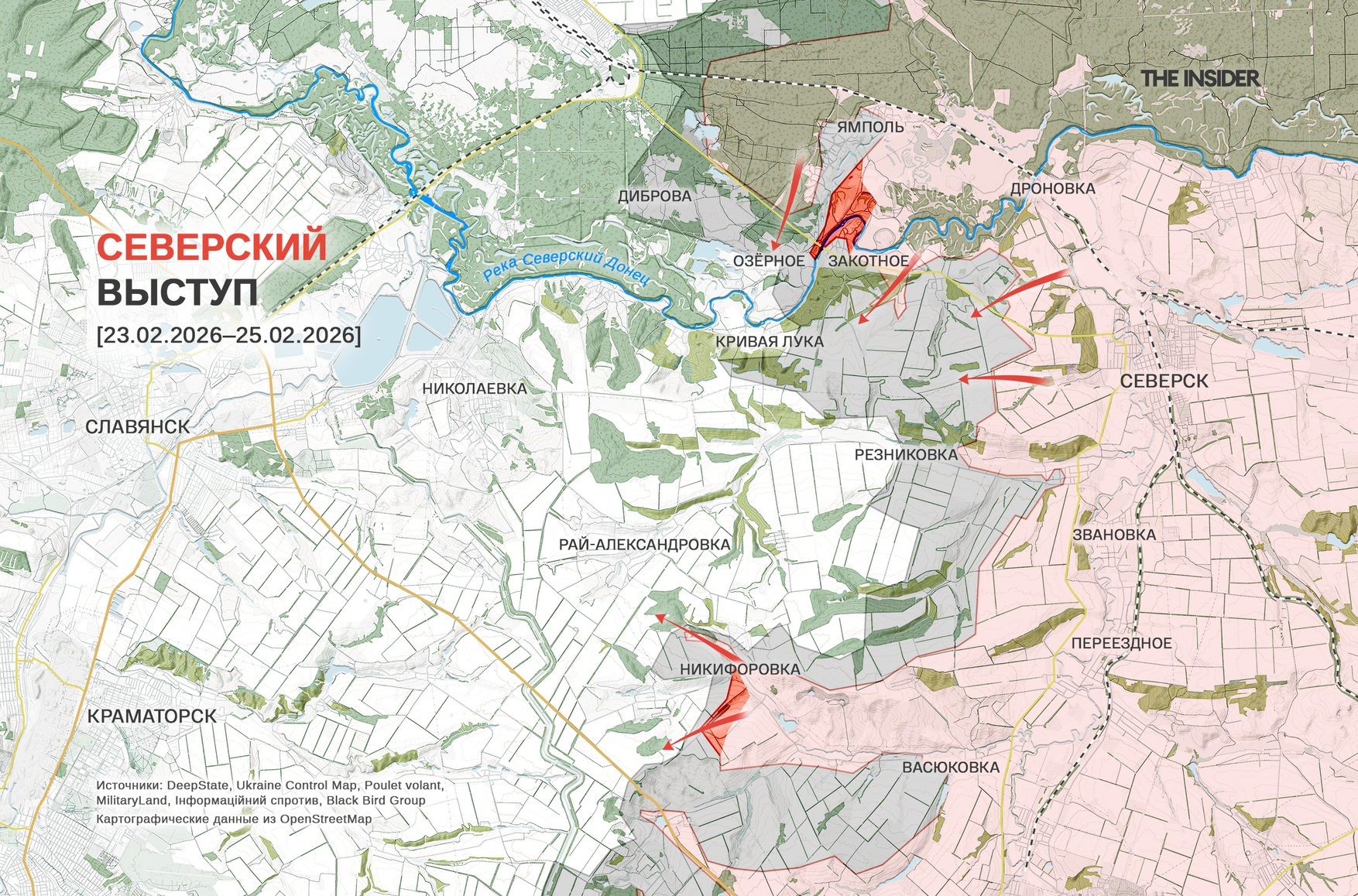 В DeepState отметили продвижение ВС РФ в районе Никифоровки к юго-западу от Северска по направлению на Краматорск. Пророссийский OSINT-ресурс «Сливочный каприз», в свою очередь, зафиксировал расширение российской зоны контроля на 500 м на подступах к Кривой Луке на правом берегу Северского Донца к западу от Северска по направлению на Славянск — к такому выводу в проекте пришли, установив место съемки видео артиллерийского обстрела российских позиций.