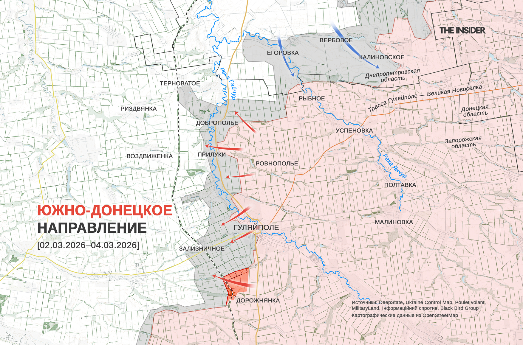 Исследователь под ником Playfra сообщает, что, согласно радиолокационным спутниковым снимкам, украинские военные установили колючую проволоку в 1–2 км от Риздвянки к юго-западу от Терноватого, что, по его мнению, опровергает российские заявления о захвате этого населенного пункта. Также он рассказывает, что в ночь на 3 марта украинская «Баба-яга» поразила российских солдат в заброшенном селе Добровольное к юго-востоку от Терноватого. По оценке исследователя, ВС РФ сохранили контроль над этим селом, несмотря на контратаки СОУ. Кроме того, Playfra пишет, что украинские силы приблизились к дороге Гуляйполе — Великая Новосёлка со стороны Днепропетровской области, но пока не могут подвести экипажи БПЛА, чтобы установить огневой контроль над этим логистическим маршрутом.