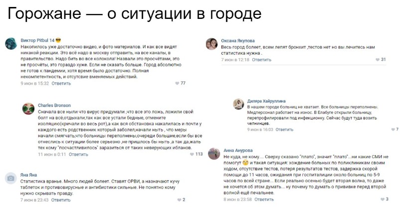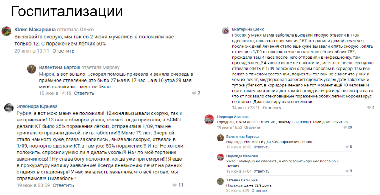 Что пишут люди. Из больниц свидетельств меньше. Те немногие жалобы, которые появляются, касаются перегрузки и, как считают комментаторы, неготовности больниц к эпидемии: «один врач на 5 боксов, к пандемии абсолютно не готовы». «Эта больница вообще не готова. Нам тяжело дышать, порою открывается удушье, у них 3-4 кислородные подушки и 1 либо вообще нет в отделениях кислородных масок. Про кислород мы вообще молчим. Они только сейчас (16.06) начали проводить кислород, в то время как мы лежим с 6.06.2020г.».