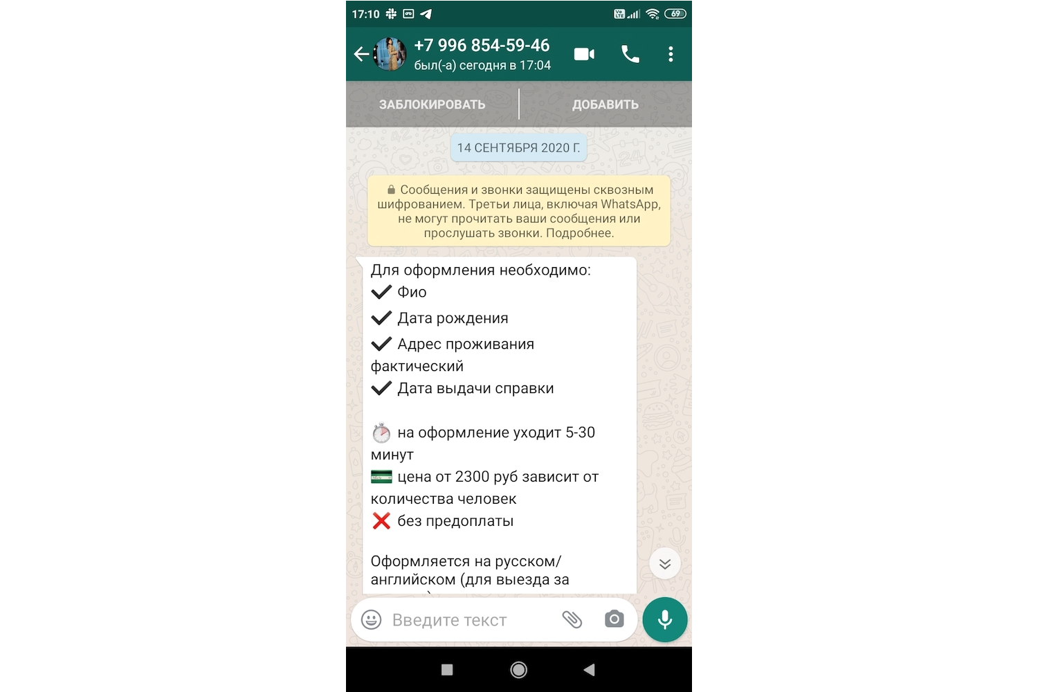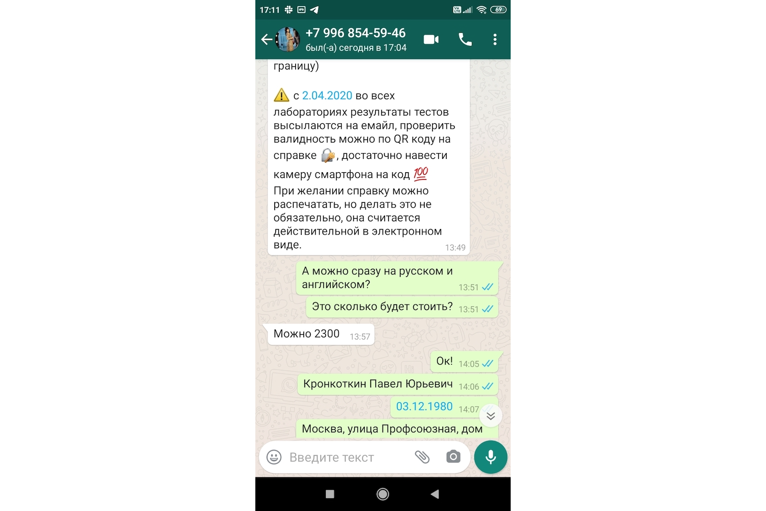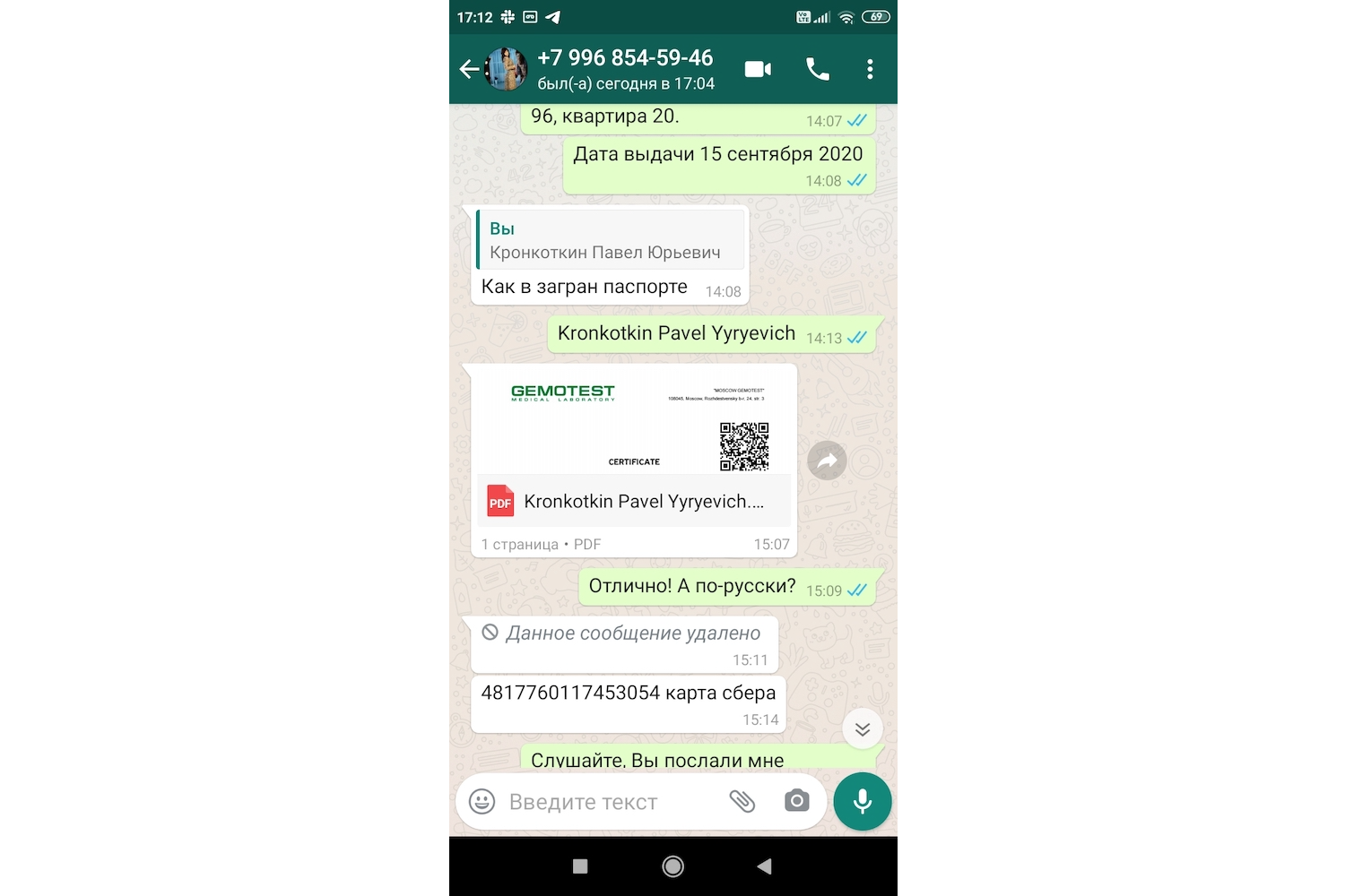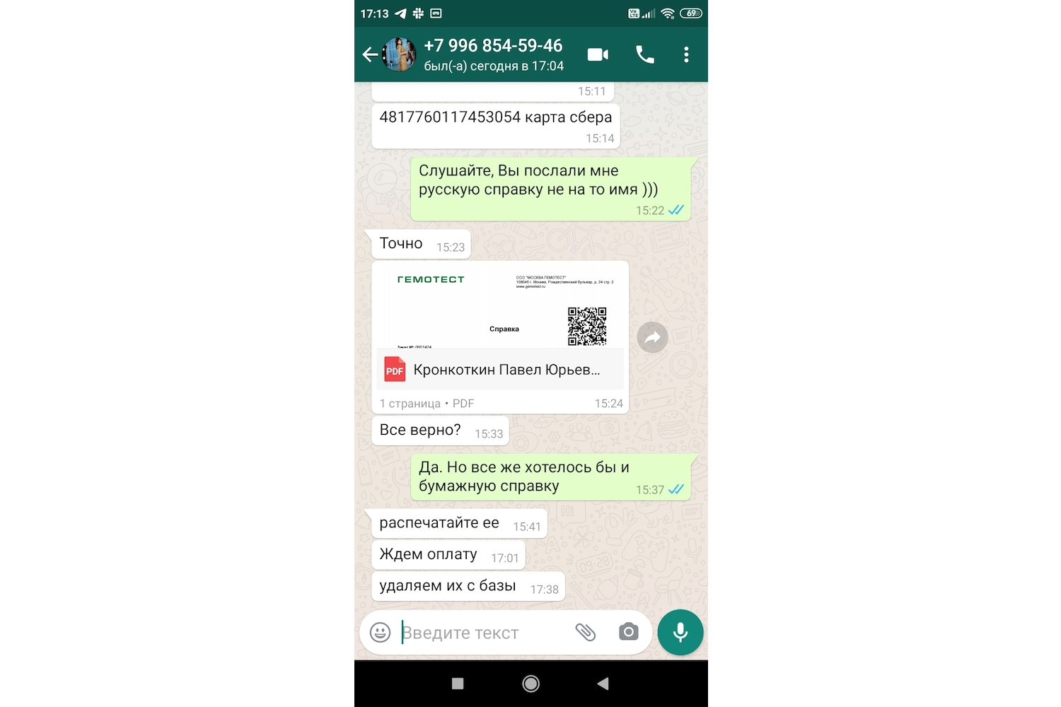 Мошенники из «Медиумплюс» встречаться отказываются, а электронные сканы справок отправляют через WhatsApp (поскольку, мол, подлинность электронной копии гарантирована QR-кодом. За это они требуют 2300 рублей на карту Сбербанка (при одновременном заказе большого количества справок цены дешевле), угрожая в случае неоплаты удалить подтверждение справки из базы «Гемотеста». The Insider проверил QR-код на справке: он ведет на gemotest.com.ru — фейковый сайт с редиректом на настоящий сайт «Гемотеста». Жуликам мы платить не стали. Последовало несколько звонков, в ходе которых некая девушка жалостливым голосом предлагала «все-таки подумать об оплате», после чего написала в WhatsApp, что удаляет информацию о наших справках из базы «Гемотеста».