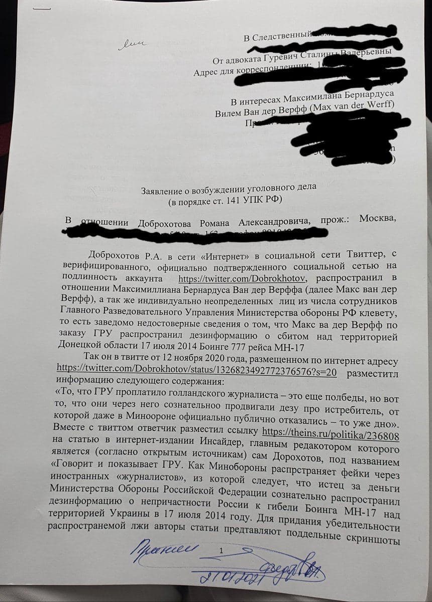 Уголовное дело против Добохотова касается материала «Говорит и показывает ГРУ». Ранее The Insider выяснил, что Макс Ван дер Верфф участвовал в дезинформационном проекте ГРУ».