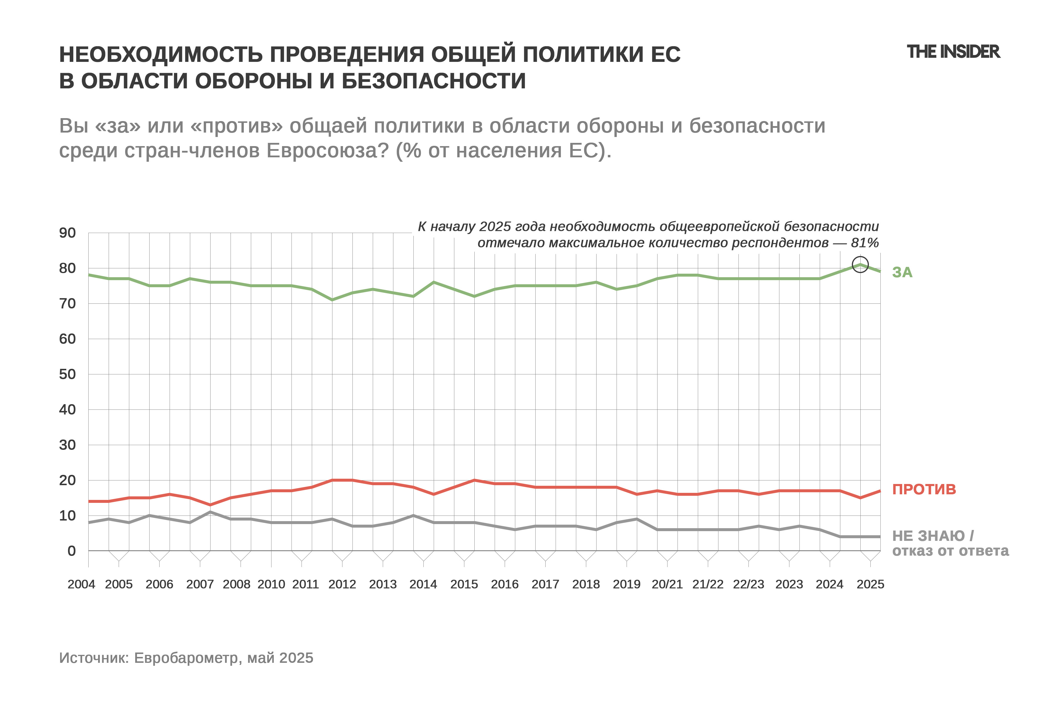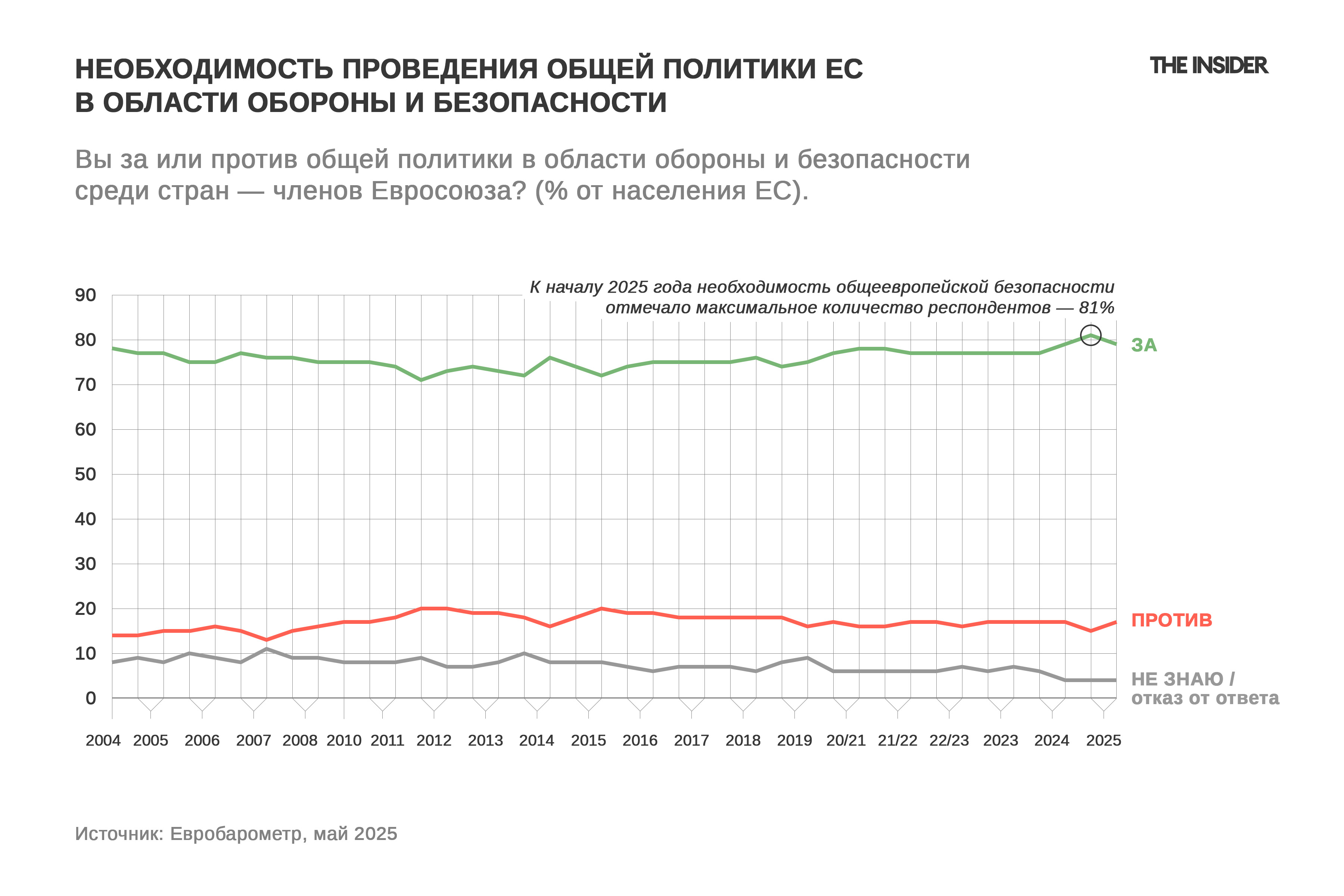 И это неудивительно, когда на восточной границе Евросоюза уже пятый год полыхает полномасштабная война, в которой большинство европейских стран поддерживают Украину. В связи с этим российская агрессия — основная причина общего роста тревожности европейцев. Естественно, что 78% опрошенных обеспокоены состоянием обороны и безопасности ЕС.